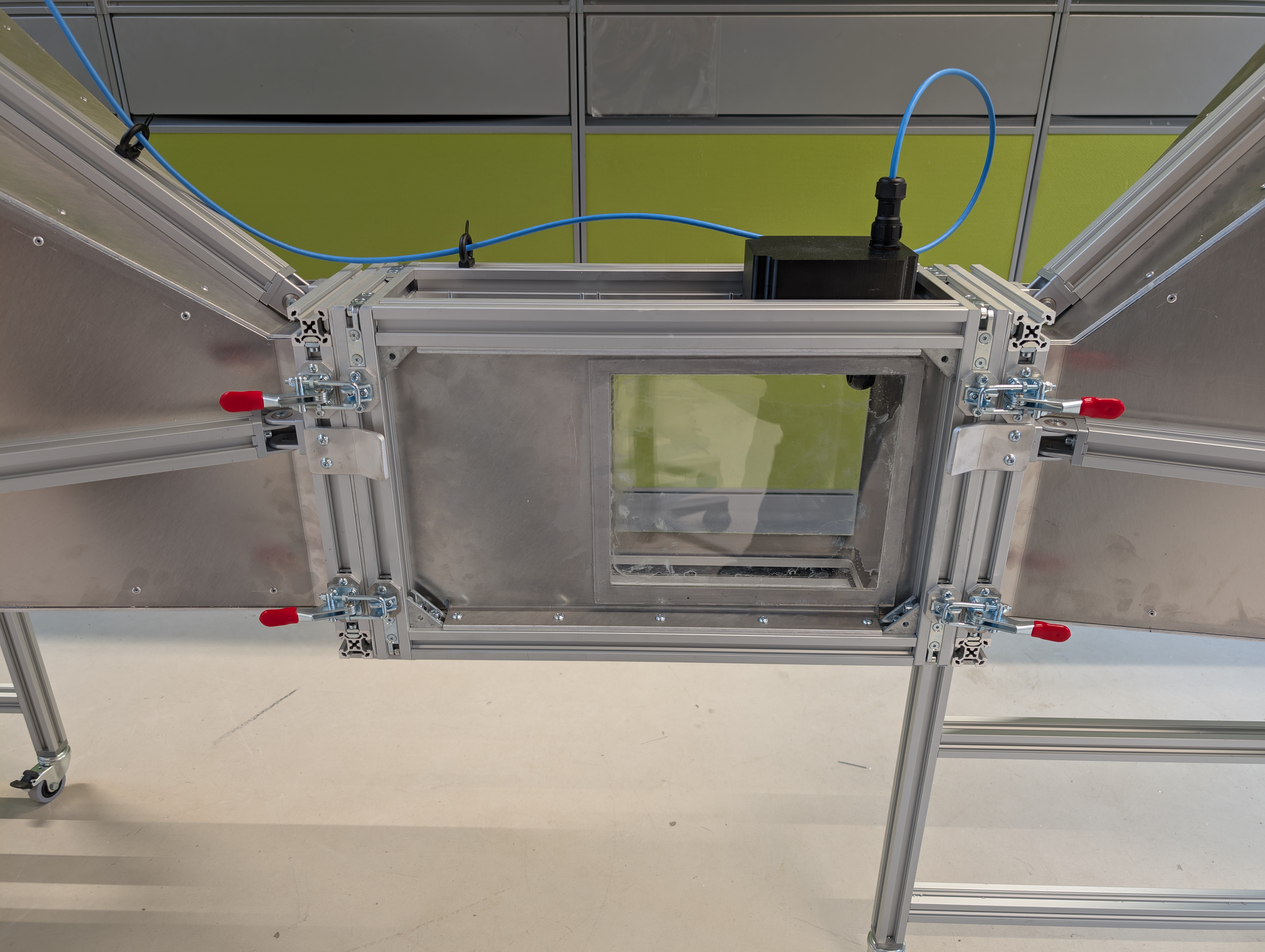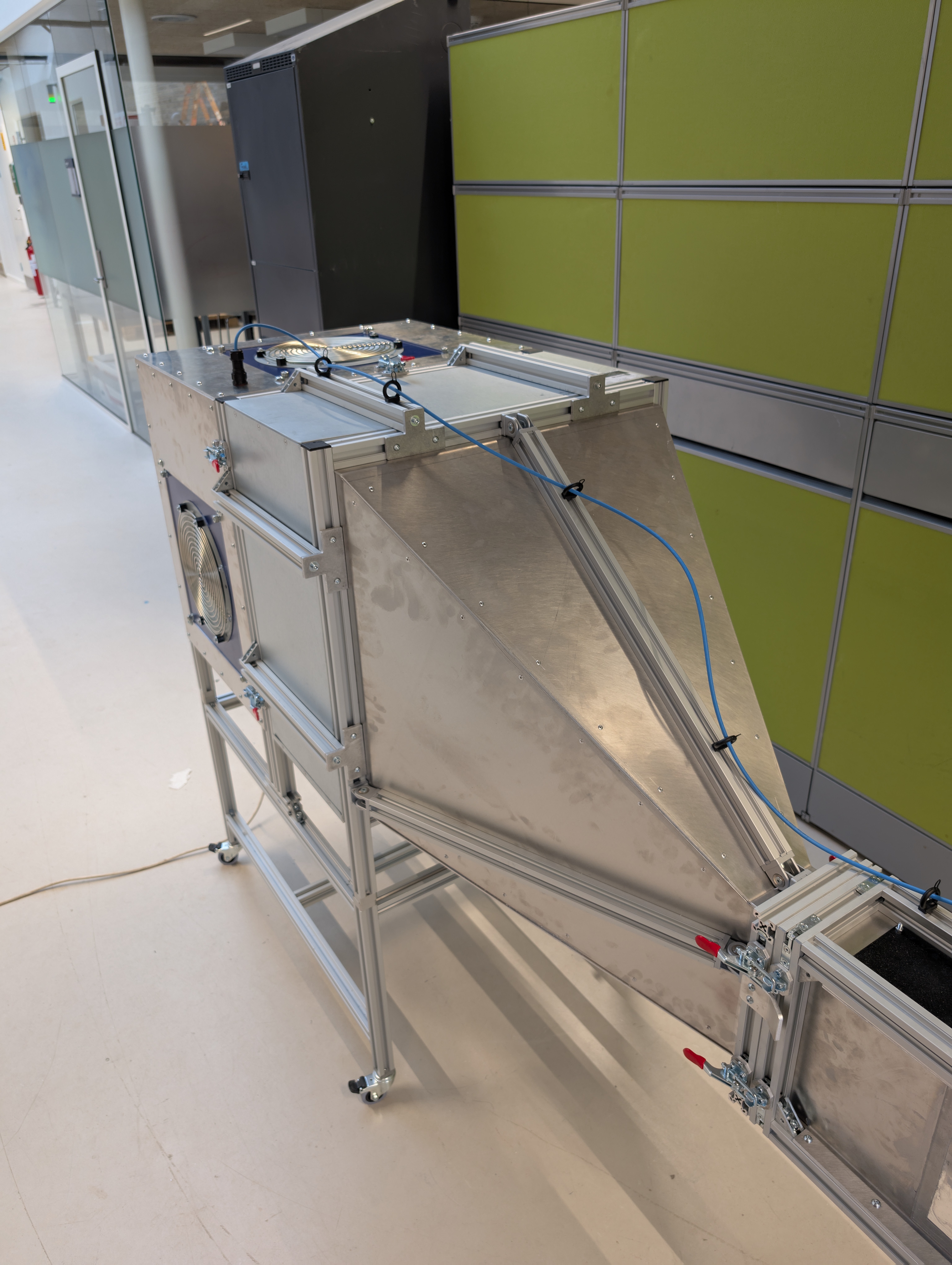 This project was developed as part of my work at Aarhus University. It involves the design of a wind tunnel for studying bioaerosolization. The procedure consists of loading a soil sample into the tunnel’s test section, where it is subjected to varying wind conditions and simulated rainfall. The resulting aerosols are then captured using output filters. While the tunnel is primarily intended for laboratory experiments, it is also designed to be portable for field deployment. The system is composed of three main sections: